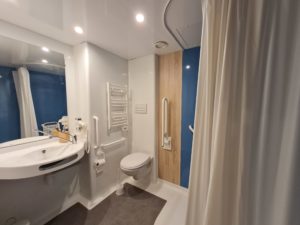La chambre dispose d’une salle d’eau privative équipée pour les P.M.R avec douche, 1 lavabo et 1 toilette .